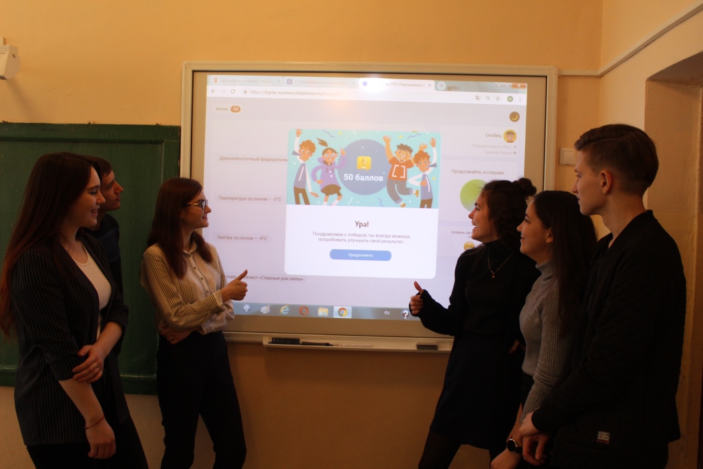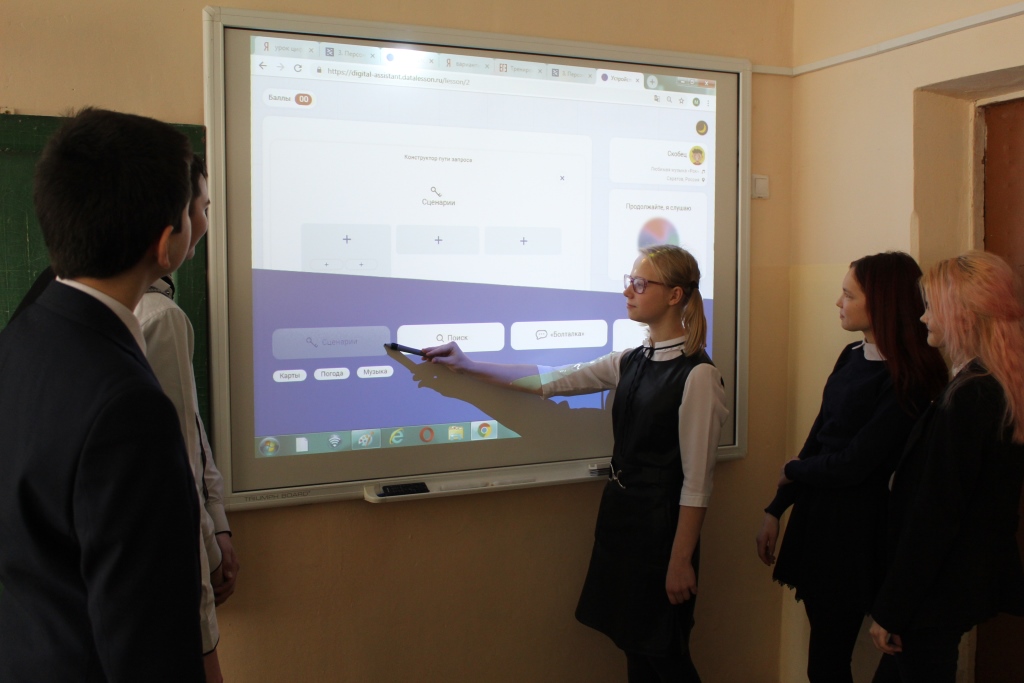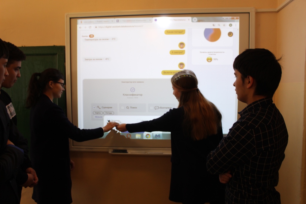 На уроке ребята узнали, что такое персональные помощники, что они умеют и где используются, познакомились с технологиями, которые лежат в основе персональных помощников, и научили чат-бота отвечать на вопросы. В компьютерном классе ребята работали не только за компьютером. но и используя интерактивную доску и работая в командах до 6 человек. А самое главное, почти все участники прошли квест и получили сертификат.