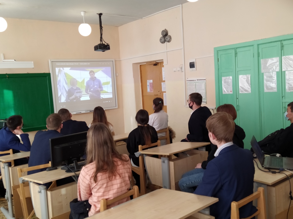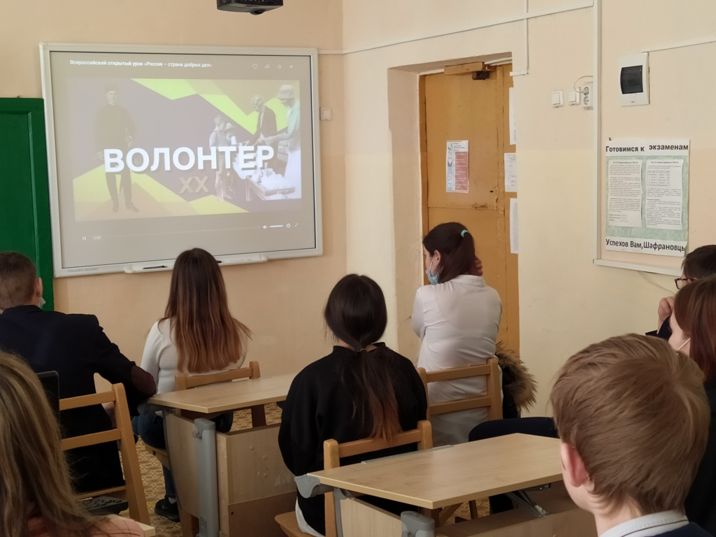 4 декабря 2020 года состоялся Всероссийский открытый урок «Россия – страна добрых дел". Ученики и учителя познакомились с волонтёрским движением в России, узнали, как ребята из различных регионов оказывают безвозмездную помощь на благо общества. На уроке ребята узнали, как можно стать добровольцем, поговорили о различных волонтёрских организациях, которые разливают антисептики, помогают людям и животным и делают жизнь лучше.