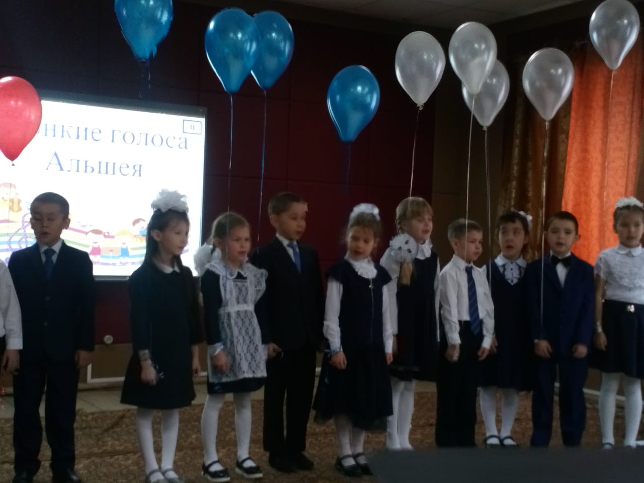 В последний день осени учащиеся 1А класса приняли участие в районном конкурсе " Звонкие голоса Альшея". Дом пионеров тепло отметил первое выступление детей на сцене. Ребята посмотрели на номера других участников и дружно исполнили под руководством своего учителя Вильдановой Н.Т песню " Белый, синий, красный "